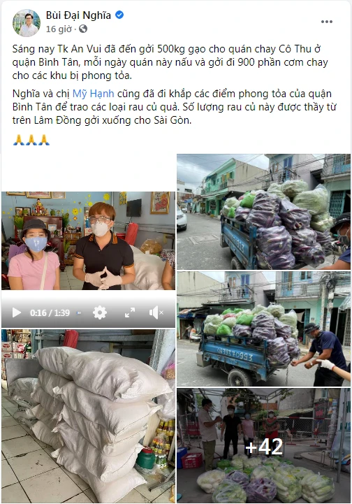 Sáng 8-7, tài khoản An Vui của MC Đại Nghĩa đã gửi đến 500 kg gạo cho quán chay cô Thu ở quận Bình Tân để nấu cơm cho các khu vực bị phong toả. Nam MC cũng cho biết: “Mỗi ngày quán này nấu và gởi đi 900 phần cơm chay cho các khu bị phong toả”.
