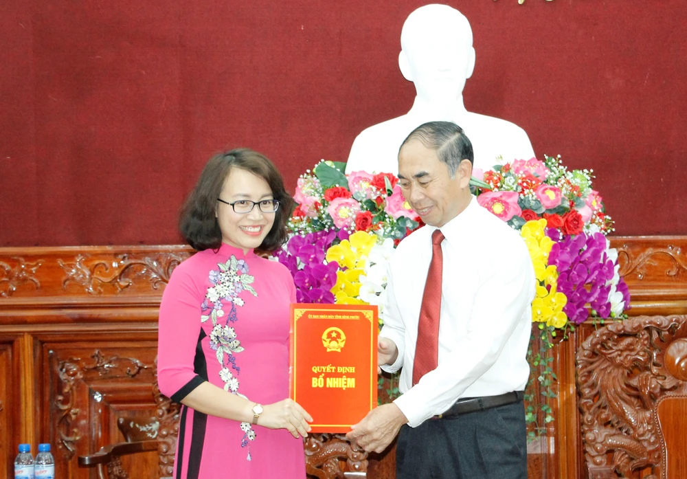 Ông Nguyễn Tiến Dũng - Phó Chủ tịch UBND tỉnh Bình Phước trao quyết định bổ nhiệm cho bà Nguyễn Thị Minh Nhâm. Ảnh: THANH TRÚC