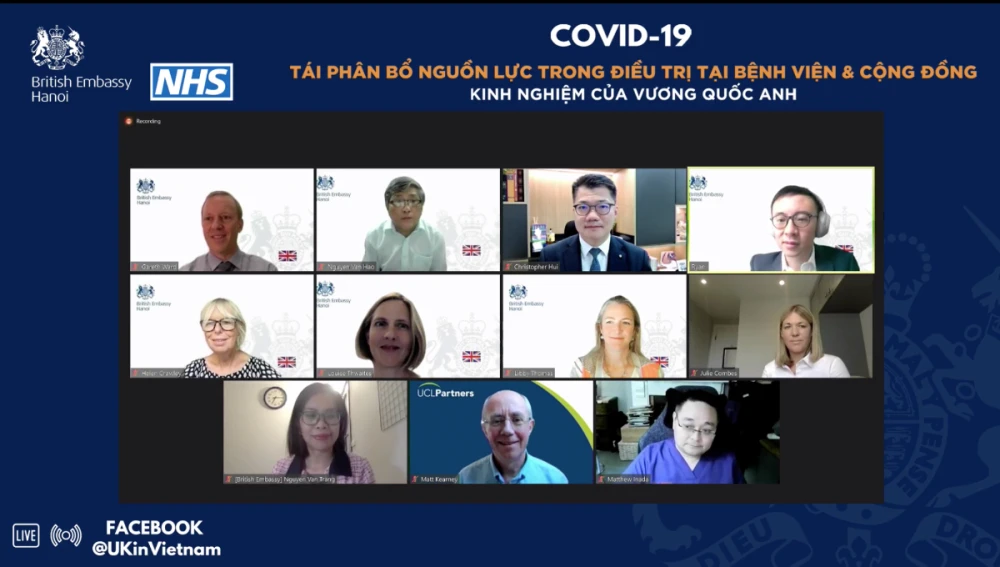 Tối 20-9, Đại sứ quán Anh tại Việt Nam đã phối hợp với Liên minh Sức khoẻ Toàn cầu thuộc Cơ quan Dịch vụ Y tế Quốc gia Anh (NHS) đã tổ chức buổi tọa đàm trực tuyến COVID-19: Tái phân bổ nguồn lực trong điều trị tại bệnh viện và cộng đồng.