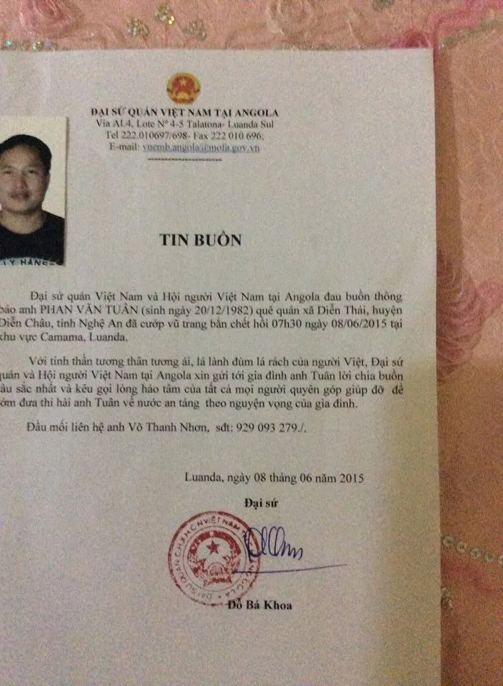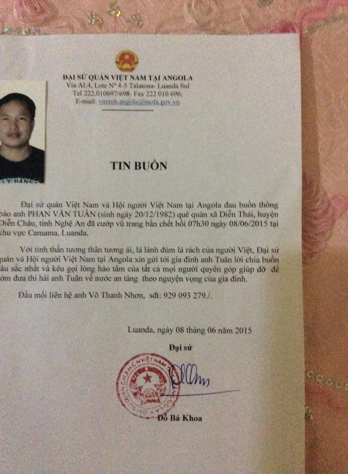 Đại sứ quán Việt Nam tại Angola đã đau buồn thông báo anh Phạm Văn Tuân bị cướp có trang bị vũ khí bắn chết và kêu gọi đóng góp giúp đỡ gia đình đưa thi thể anh Tuân về Việt Nam.
