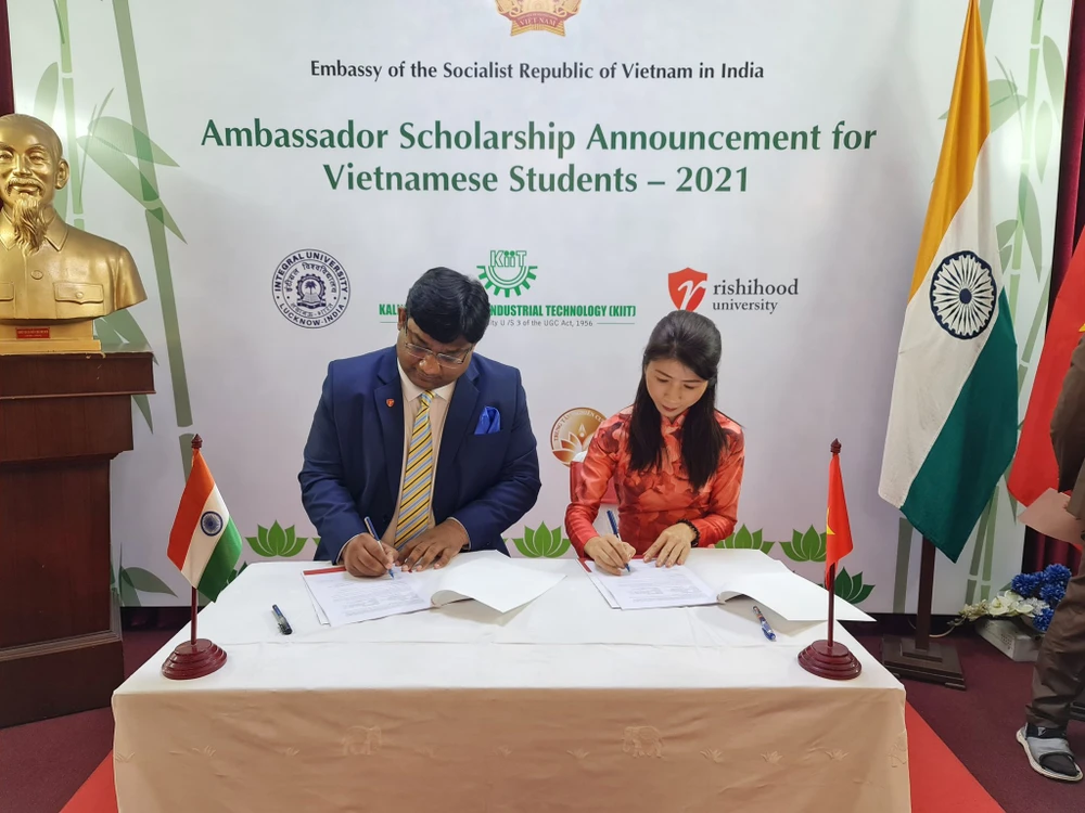 Theo thông báo báo chí cùng ngày, Chương trình học bổng Đại sứ năm 2021 gồm 113 suất học bổng các chương trình đại học, thạc sĩ và tiến sĩ tại bốn trường đại học là Đại học Integral (TP Lucknow, bang Uttar Pradesh), Viện Công nghệ công nghiệp Kalinga (TP Bhubaneswar, bang Odisha), Đại học Rishihood (bang Haryana) và Đại học Sharda (TP Greater Noida, bang Uttar Pradesh).