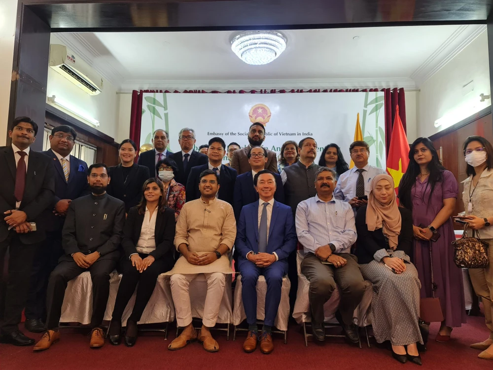 Đại sứ Phạm Sanh Châu và các đại biểu chụp ảnh kỷ niệm sau lễ công bố học bổng và phiên thảo luận hợp tác giáo dục Ấn Độ-ASEAN ngày 17-3. Ảnh: ĐSQ Việt Nam tại Ấn Độ