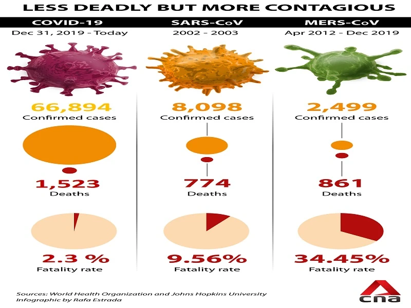 Đồ họa so sánh số ca nhiễm bệnh, số ca tử vong và tỉ lệ tử vong (từ trên xuống dưới) tính đến ngày 15-2 của dịch COVID-19 so với dịch SARS và MERS. Ảnh: CHANNEL NEWS ASIA