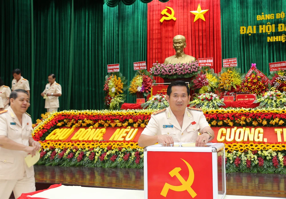 Đại tá Đinh Văn Nơi, Giám đốc Công an tỉnh An Giang cùng các đại biểu bỏ phiếu bầu tại đại hội. Ảnh: HD