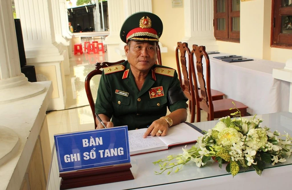 Trung tướng Nguyễn Hoàng Thủy, Tư lệnh Quân khu 9 ghi sổ tang tại Lễ viếng đại tướng sáng 3-5. Ảnh: NN