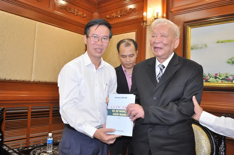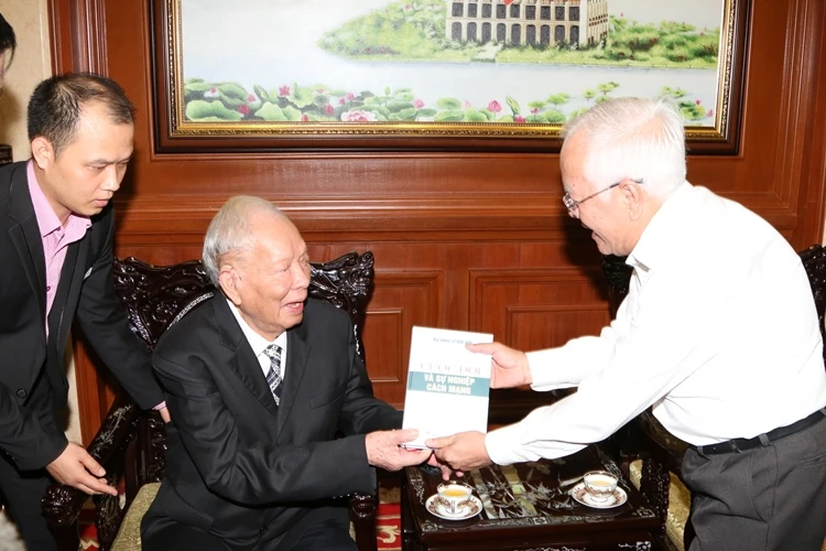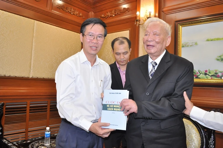 Đại tướng Lê Đức Anh tặng cuốn hồi ký cho Phó Bí thư Thường trực Thành ủy TP.HCM Võ Văn Thưởng.