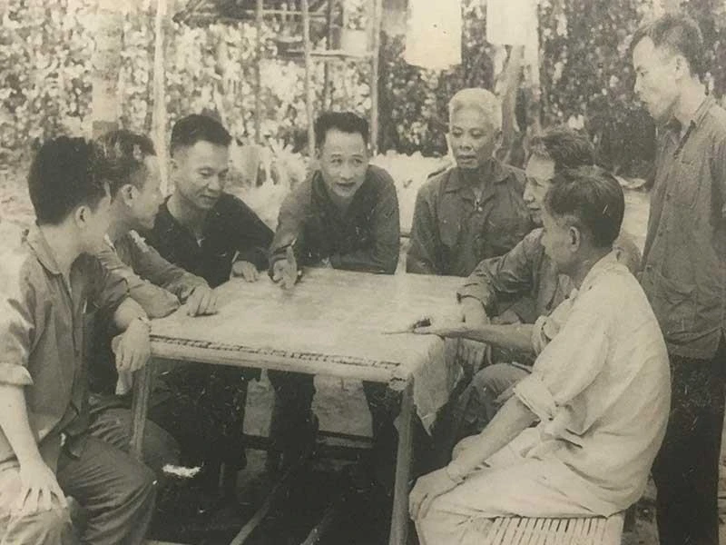 Đại tướng Lê Đức Anh (thứ ba từ trái sang) trong một cuộc họp của Bộ Chỉ huy miền ở căn cứ Lộc Ninh (tỉnh Bình Phước ngày nay) năm 1972, khi đó ông đang là tham mưu trưởng. Ảnh: TƯ LIỆU
