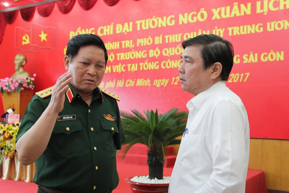 Bộ trưởng Quốc phòng - Đại tướng Ngô Xuân Lịch (trái) và Chủ tịch UBND TP.HCM Nguyễn Thành Phong tại buổi làm việc. Ảnh: Hoàng Giang