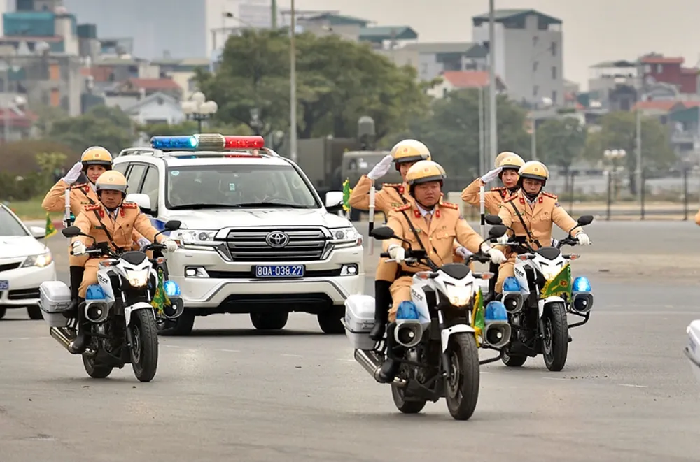 Cảnh sát giao thông dẫn đoàn trong buổi Lễ xuất quân và diễn tập phương án bảo vệ Đại hội lần thứ XIII của Đảng, ngày 10-1. Ảnh: VGP
