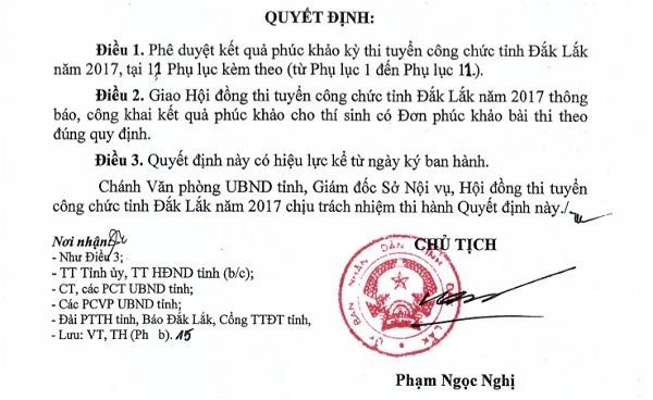 Chủ tịch UBND tỉnh đã ký kuyết định phê duyệt kết quả phúc khảo kỳ thi công chức tỉnh năm 2017.