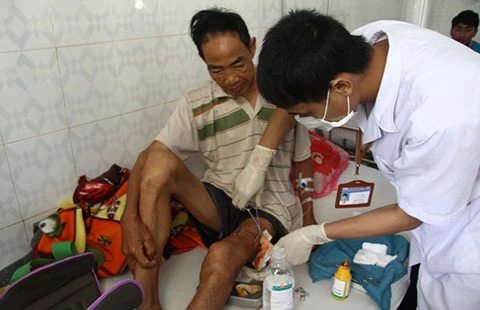 Bác sĩ đang băng bó lại vết thương cho nạn nhân Đường. Ảnh: ĐD