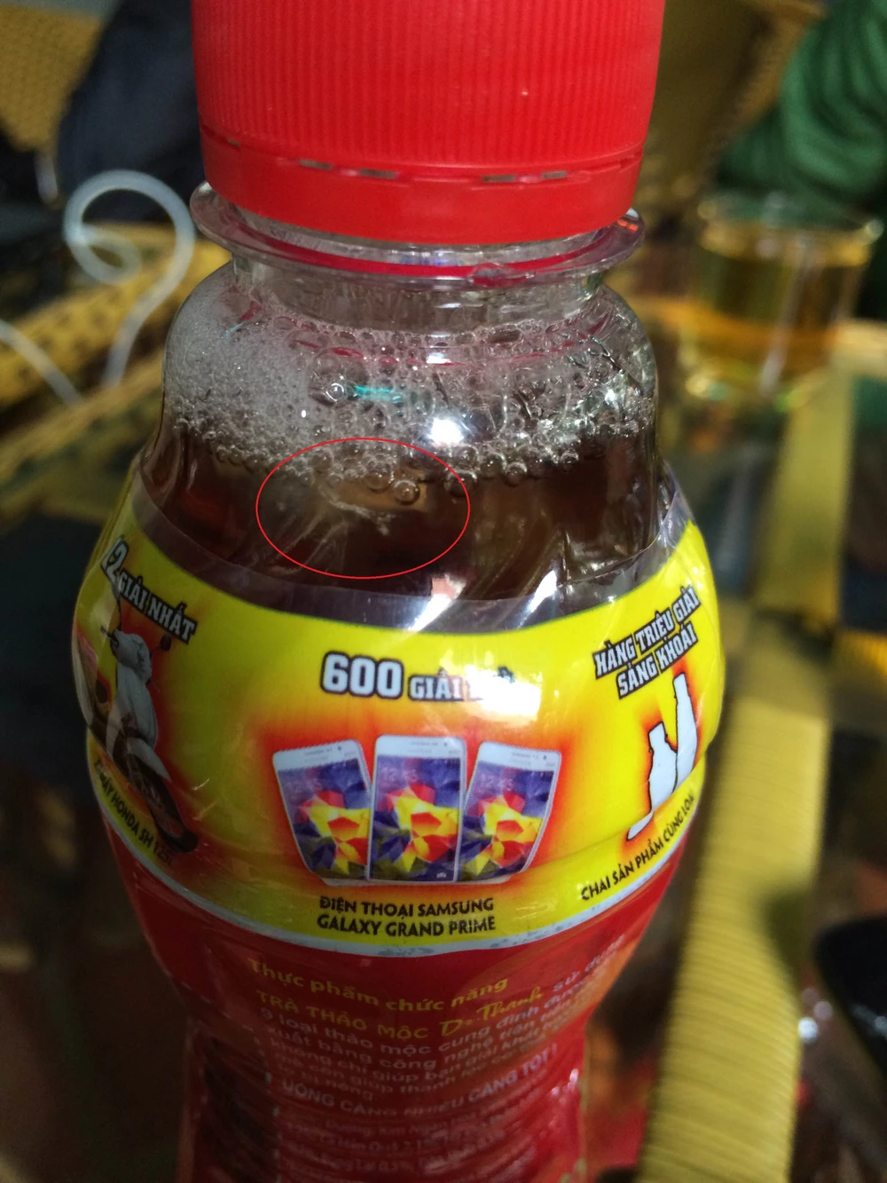 Chai trà Dr. Thanh có dị vật (vòng tròn đỏ) do người dân cung cấp.