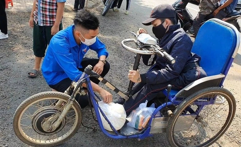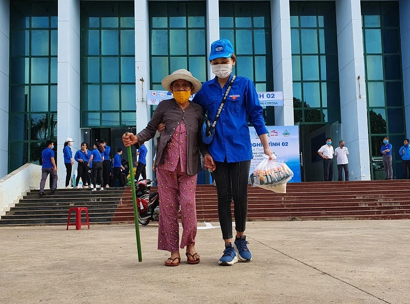 Một tình nguyện viên đưa người già đến nhận gạo về nhà.