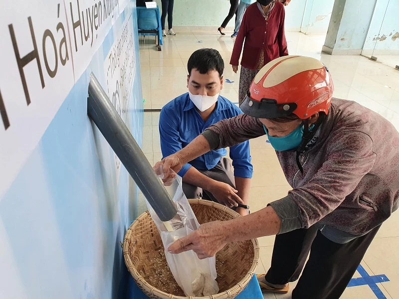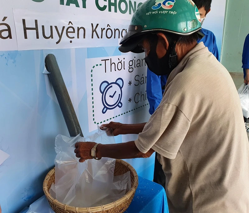 Người dân đưa bao nhận gạo ở cây ATM gạo.