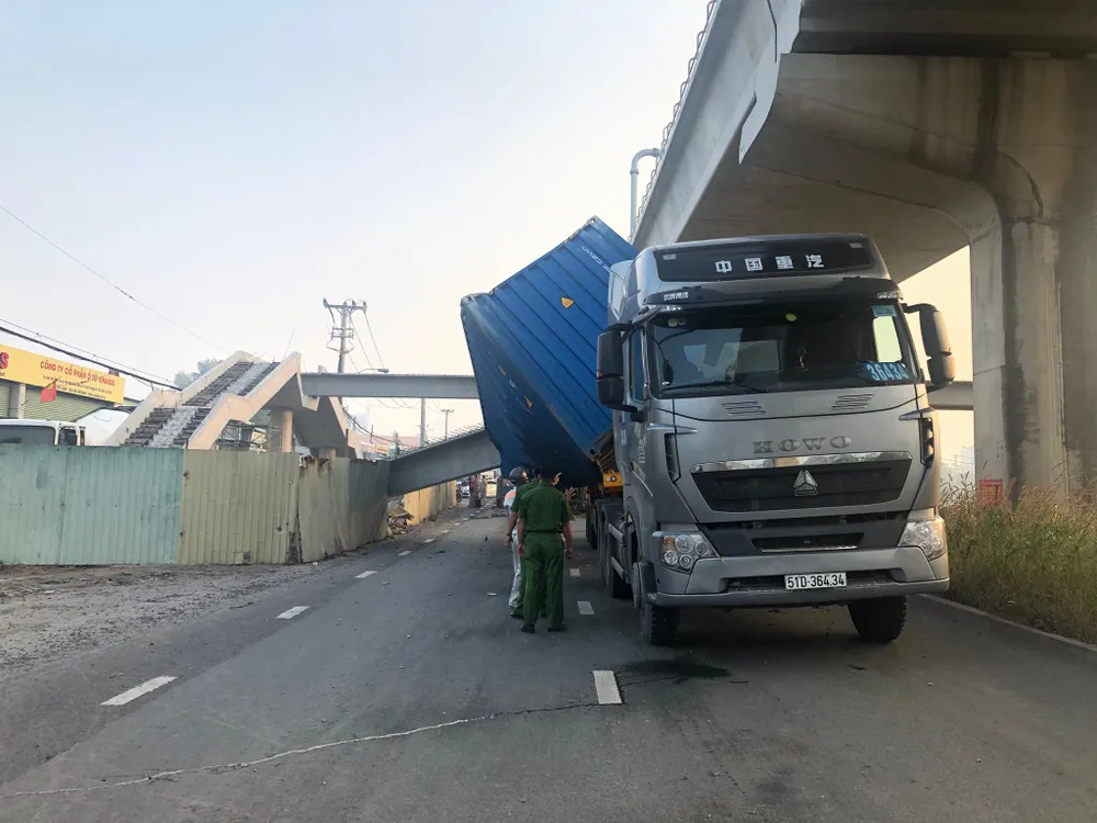 Khi đến cầu bộ hành khu vực Suối Tiên (phường Linh Trung, quận Thủ Đức, TP.HCM) thì thùng container va vào dầm bê tông gầm cầu bộ hành nằm trong dự án công trình hầm chui nút giao thông Đại học Quốc gia đang xây dựng. Vụ việc khiến dầm bê tông này rớt xuống và đè gần như bẹp dúm thùng container.