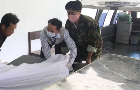 Cơ quan chức năng đưa thi thể Huỳnh Quang Thức về bệnh viện. Ảnh: LT