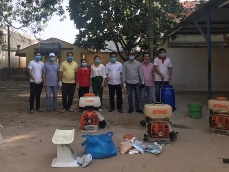 Trung tâm Y tế huyện Bàu Bàng chuẩn bị dụng cụ phun thuốc khử trùng trước khi đám cưới diễn ra. Ảnh: TTYT cung cấp