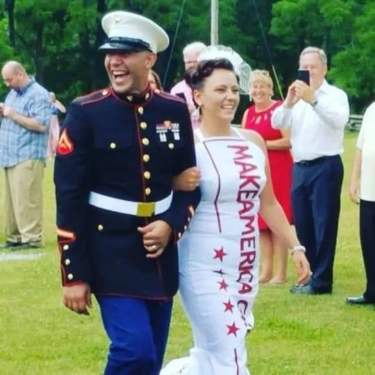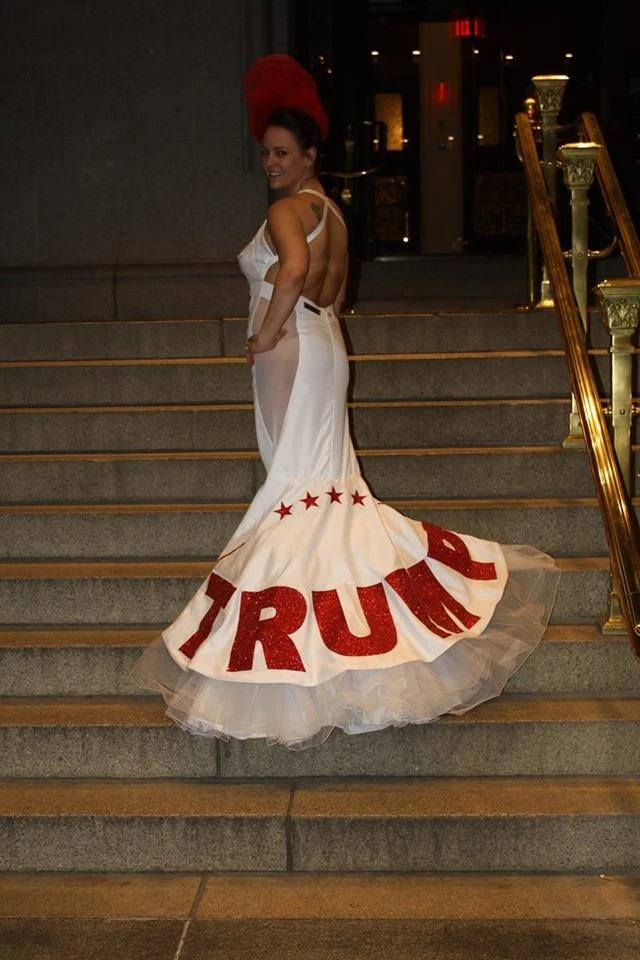 Cô dâu mặc một chiếc váy trắng phía trước có in dòng chữ "Đưa nước Mỹ vĩ đại trở lại" là khẩu hiệu tranh cử năm 2016 của Tổng thống Donald Trump. Phía sau chiếc váy còn được đính dòng chữ "Trump" màu đỏ, to tướng được phủ kim tuyến lấp lánh.