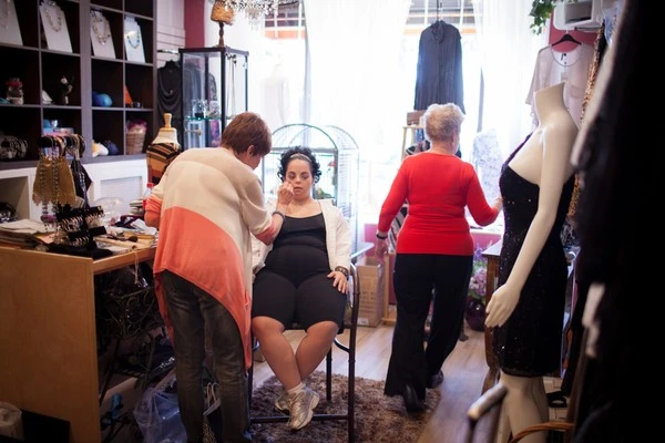 Một người bạn hàng xóm giúp cô gái trang điểm và mặc váy cưới.
