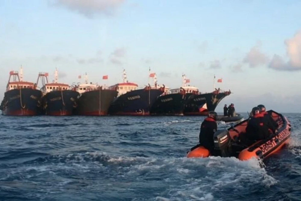 Một tàu tuần tra của lực lượng tuần duyên Philippines tiếp cận các tàu Trung Quốc tại khu vực đá Ba Đầu ( thuộc quần đảo Trường Sa của Việt Nam). Ảnh: EPA