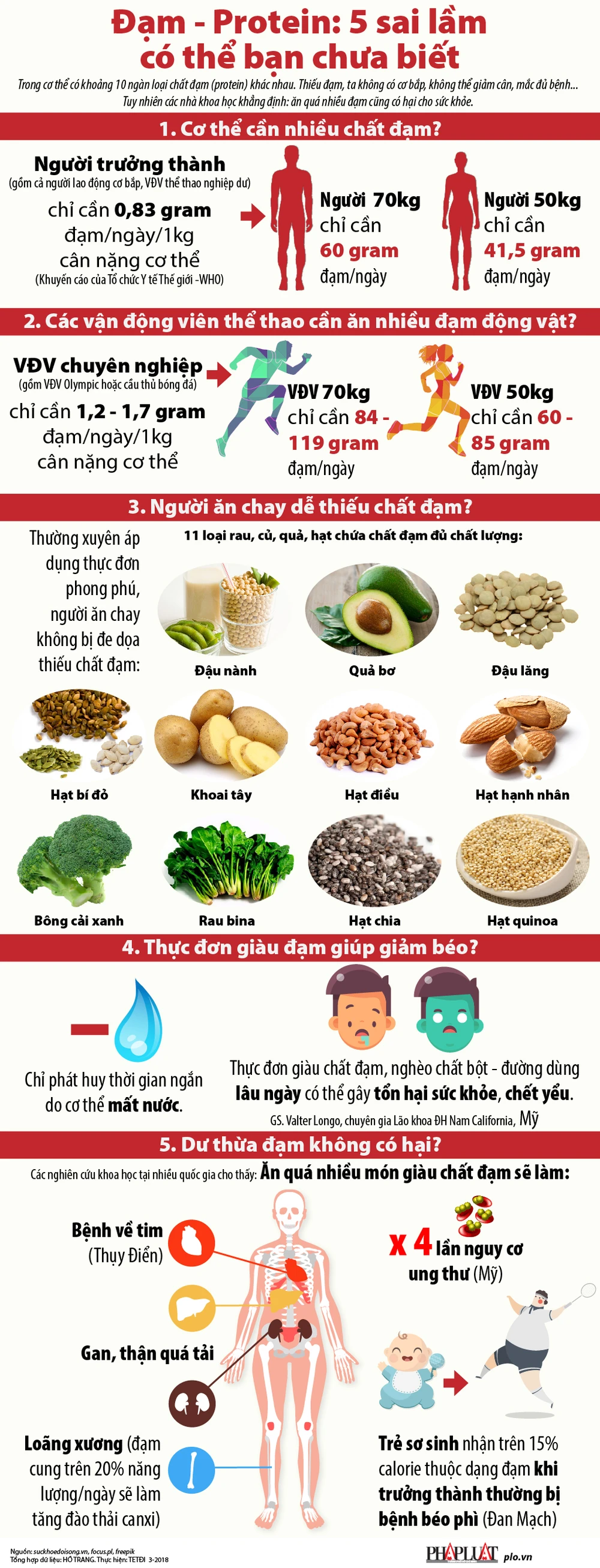 (PLO)- Đạm, protein là chất quan trọng với cơ thể. Thiếu đạm, ta không có cơ bắp, không thể giảm cân, mắc đủ bệnh... Tuy nhiên, các nhà khoa học khẳng định: ăn quá nhiều đạm cũng có hại cho sức khỏe. Dưới đây là 5 suy nghĩ sai lầm thường gặp về chất đạm được giải đáp gần đây: