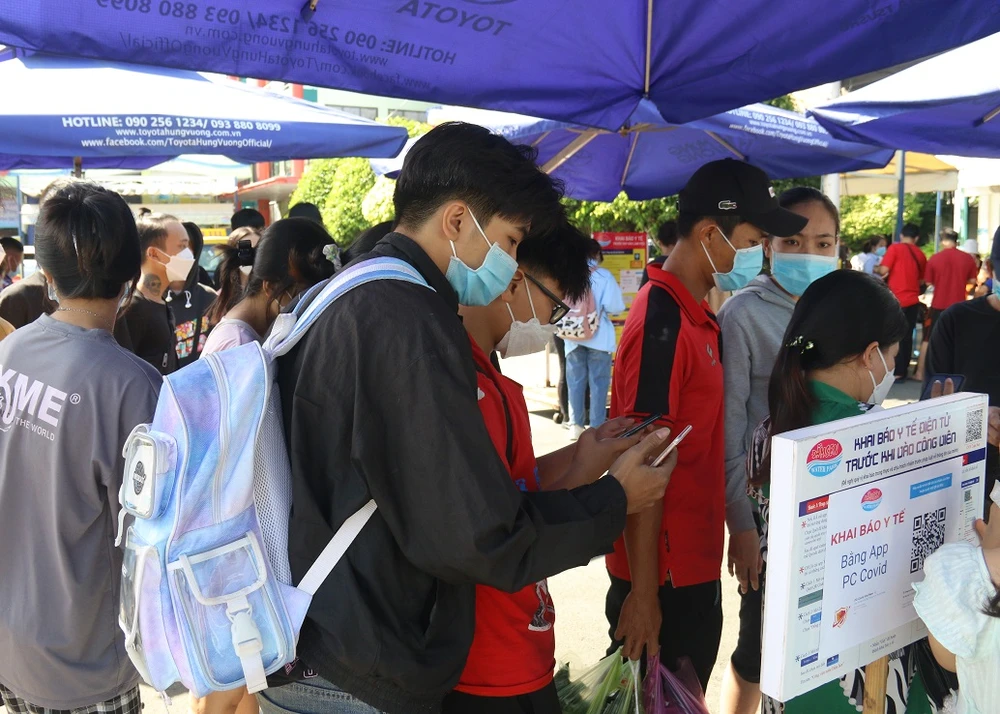 Người dân khai báo y tế trước khi vào cổng. Ảnh: THẢO PHƯƠNG