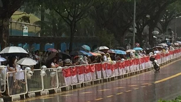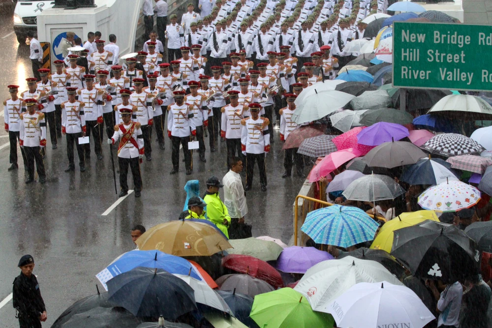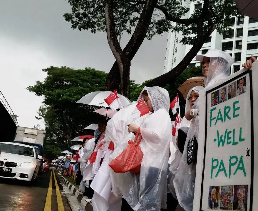 Bên ngoài tòa nhà Quốc hội, mưa lớn như trút nước khi quá trình tiễn đưa ông Lý Quang Diệu bắt đầu. Ông James Wong, một trong những người xếp hàng dưới mưa cho biết "mưa có lớn như thế nào đi chăng nữa cũng không thể ngăn chúng tôi đổ xuống đường tiễn ông Lý Quang Diệu".