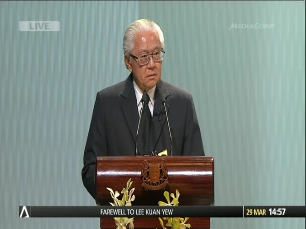 15 giờ 00 (Giờ Singapore): Tổng thống Singapore Tony Tan Keng Yam nói "Ở cương vị một quốc gia, chúng tôi thương tiếc Người đàn ông đã làm nên sự khác biệt. Lý tưởng của ông Lý Quang Diệu đã rất rõ ràng. Ông Lý Quang Diệu tin tưởng và sống vì điều ấy - "trọng dụng nhân tài, sự trung thực và tính toàn vẹn". Ông làm việc trong cả cuộc đời của mình để xây dựng một dân tộc đoàn kết, được tôn trọng và toàn dân đều được chăm sóc".
