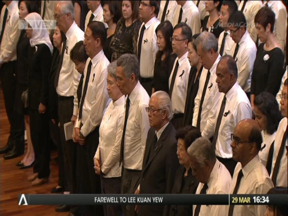 16 giờ 35 (Giờ singapore): Tất cả mọi người đứng lên dành một phút mặc niệm cuối cùng đối với cố Thủ tướng Lý Quang Diệu.
