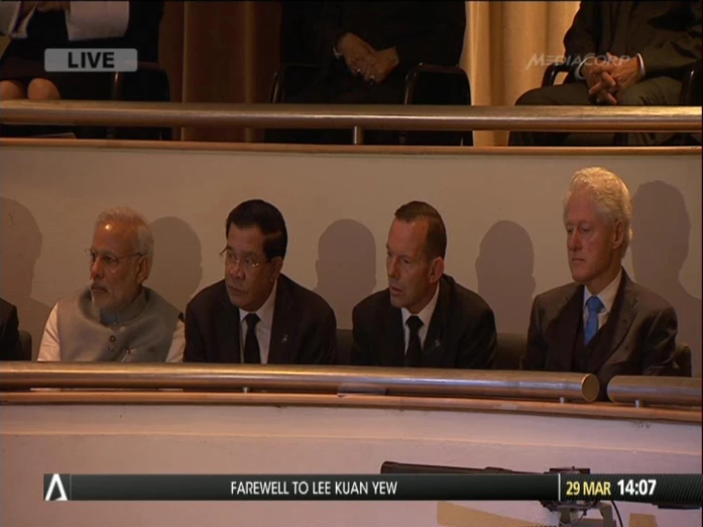 14 giờ 00 (Giờ Singapore): Trong số hơn 2.200 người tại lễ tang, giới chức sắc quốc tế đến từ hơn 20 quốc gia cũng tham dự tại UCC, gồm Tổng thống Indonesian Joko Widodo, Thủ tướng Cambodia Hun Sen, Thủ tướng Nhật Shinzo Abe, Thủ tướng Úc Tony Abbott, Thủ tướng Ấn Độ Narendra Modi, và cựu Tổng thống Mỹ Bill Clinton...