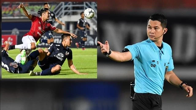 Pha bóng dẫn đến Sanrawat (áo đỏ) bị oan và trọng tài Arkhom bị đánh.