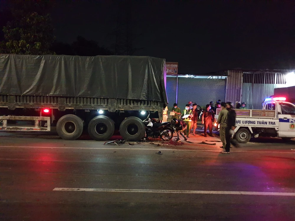 Cú tông mạnh khiến cả hai thanh niên ngã ra đường, tử vong tại chỗ. Chiếc xe máy cắm vào đuôi xe đầu kéo hư hỏng nặng.