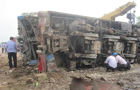 Thời điểm trên, xe đầu kéo 15C-037.24 do tài xế Chu Văn Thắng điều khiển chở 25 tấn gạo từ quốc lộ 10 vượt qua đường sắt để vào sân một doanh nghiệp. Khi phần đuôi xe đầu kéo vẫn nằm ngang đường sắt thì bị tàu D19E-924 đâm trực diện. Hậu quả, đầu máy tàu lửa bị văng khỏi đường ray và đổ nhào ra quốc lộ 10, toa xe liền kề cũng trật khỏi đường ray (ảnh). Trong khi đó, thùng chở gạo của xe đầu kéo bị bẹp dúm. Hơn 100 m đường ray bị hư hỏng, lái tàu Nguyễn Quang Đông, phụ lái Nguyễn Công Vũ và một hành khách bị thương nặng.