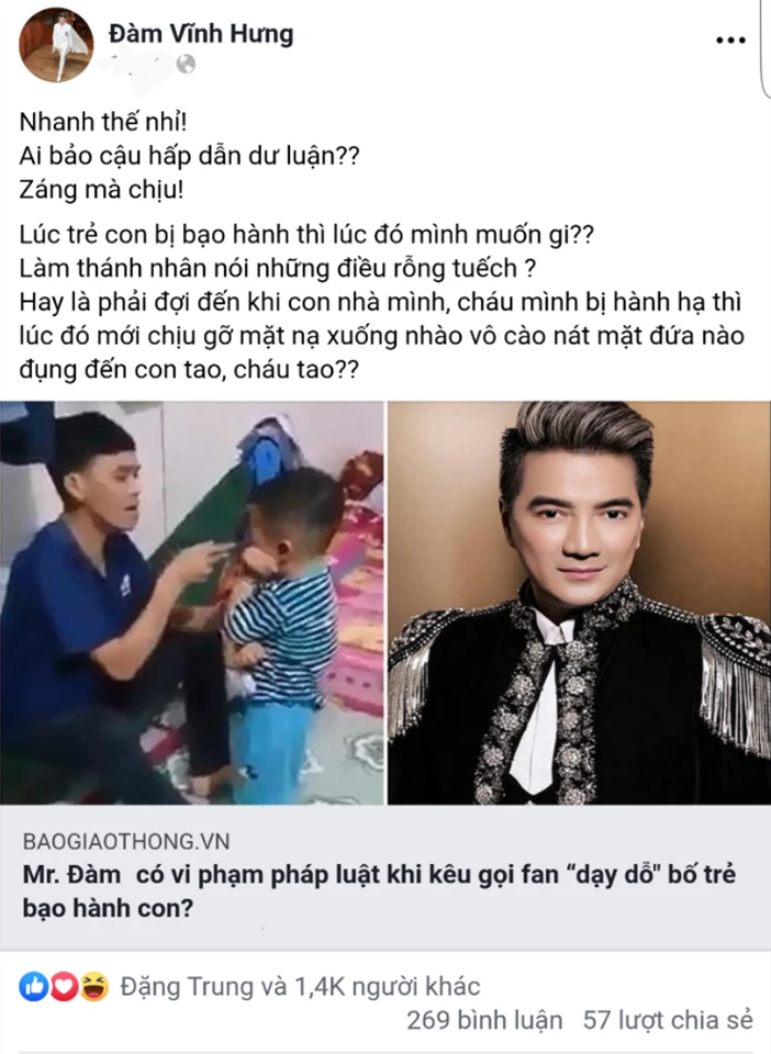 Trước sự phản ứng của những ý kiến trái chiều đó, nam ca sĩ đã gỡ bài đăng nhưng lại tiếp tục tuyên chiến với những người phản đối mình bằng một bài đăng đầy khiêu khích: "...Làm thánh nhân nói những điều rỗng tuếch? Hay là phải đợi đến khi con nhà mình, cháu nhà mình bị hành hạ thì lúc đó mới chịu gỡ mặt nạ xuống nhào vô cào nát mặt đứa nào đụng đến con tao, cháu tao?".