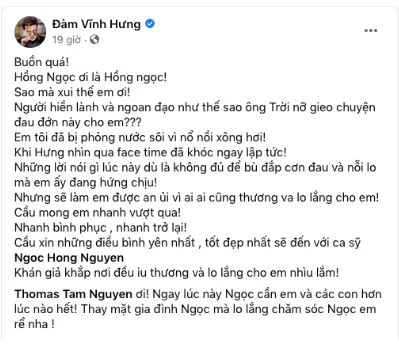 Tối 8-5, Đàm Vĩnh Hưng khiến khán giả xôn xao khi đăng tải bài viết chia sẻ nữ ca sĩ Hồng Ngọc bị tai nạn khi nồi xông hơi ở nhà bất ngờ phát nổ khiến cô bị phỏng nước sôi nặng làm 2/3 khuôn mặt biến dạng.