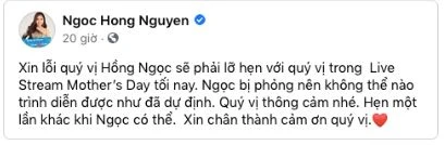 Hồng Ngọc đã xin lỗi vì không thể biểu diễn trong buổi Live Stream Mother’s Day như dự định.