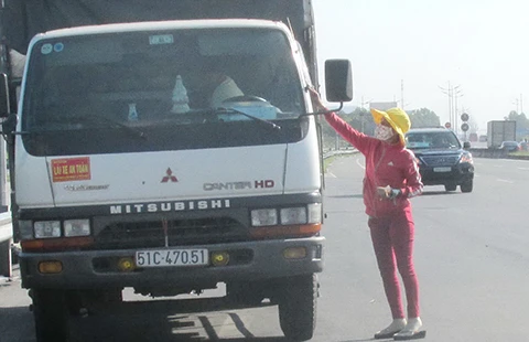 Một phụ nữ bán logo “Lái xe an toàn, tính mạng con người là trên hết” tại đường dẫn vào cao tốc TP.HCM - Trung Lương hôm 7-12. Ảnh: NGUYỄN DŨNG