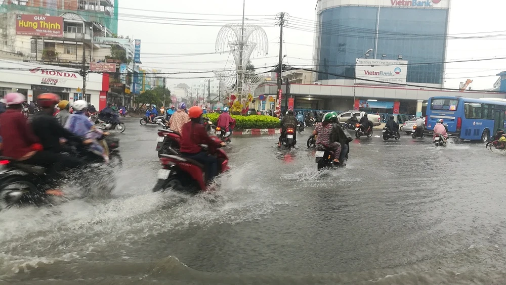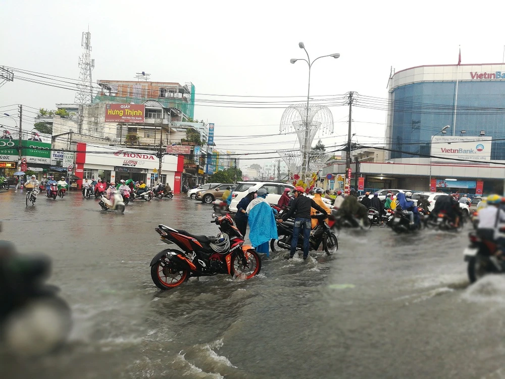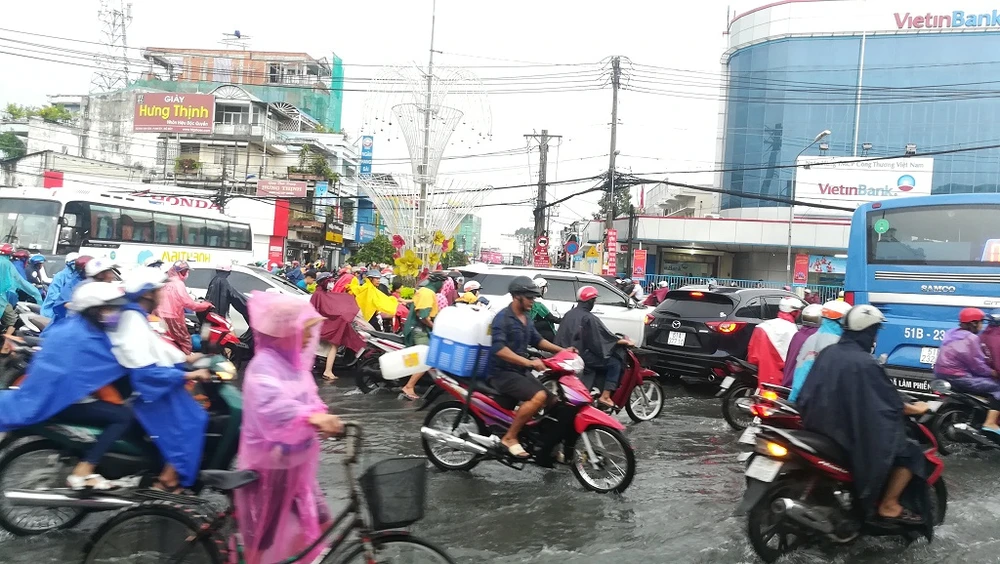 Mỗi khi mưa lớn, giao thông qua khu vực vòng xoay chợ Thủ Đức rơi vào tình trạng rối rắm, hỗn loạn.