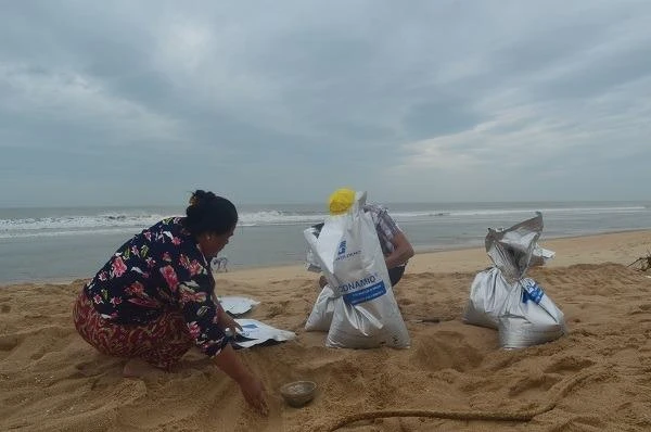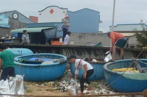 Ông Lâm Văn Hoàng, nhà có năm thuyền thúng, cho biết: Nhận được thông tin bão đổ bộ, gia đình ông và nhiều hộ khác lấy cát dưới biển bỏ vào bao tải để chằng chống mái nhà.
