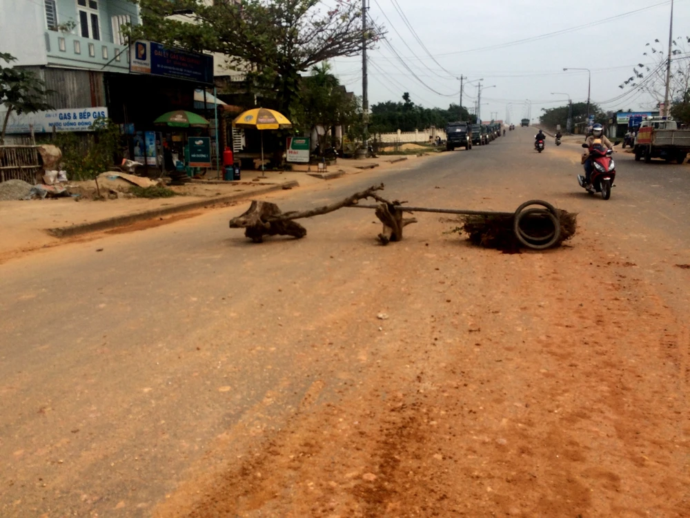 Dân làm hàng rào chặn xe. Ảnh: Quang Nam
