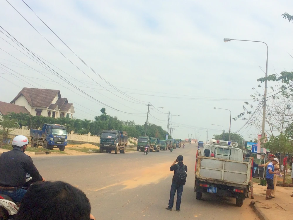 Trên lề đường, hàng chục xe tải bị chặn đứng sắp thành hàng dài. Phía CSGT cũng đã tiến hành kiểm tra xe, làm việc với các tài xế chạy xe trên. Hàng chục hộ dân phản ánh, mặc dù đã rất nhiều lần phản ánh sự việc với cơ quan chức năng và phía cơ quan chức năng đã làm việc nhưng xe vẫn ngang nhiên chạy không kể ngày đêm, bụi đất ngập nhà dân và đất đổ dọc đường khiến họ hết sức bức xúc.