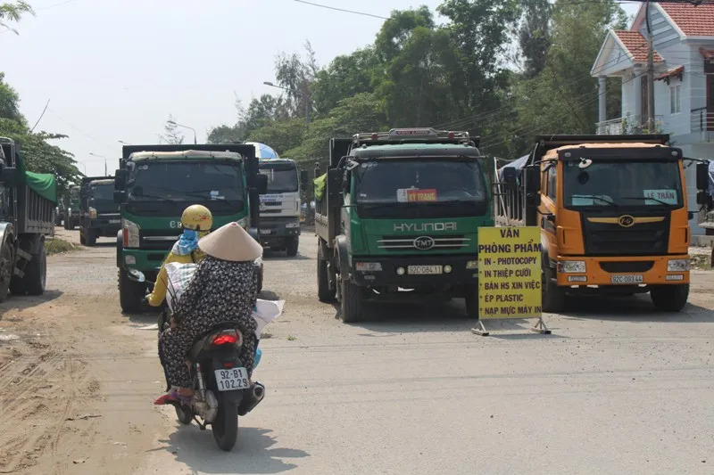 Theo đó, hơn 9 giờ cùng ngày, đoạn qua thôn Vĩnh Bình (xã Tam Thăng), người dân đã mang nhiều biển hiệu cùng các vật cản khác ra đường để chặn đoàn xe chở đất không cho lưu thông. Hàng chục phương tiện nằm chờ trên đường ở dọc hai bên tuyến đường.