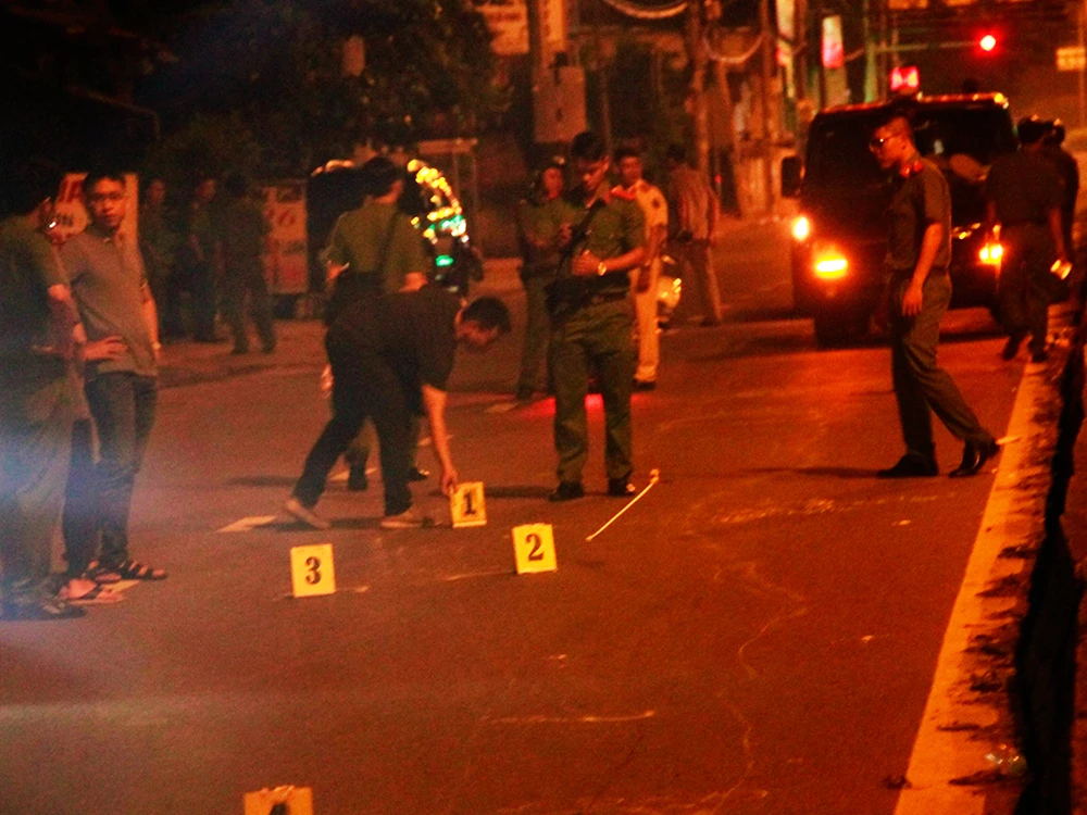 Cảnh sát khám nghiệm hiện trường, điều tra vụ việc. Ảnh Nguyễn Tân