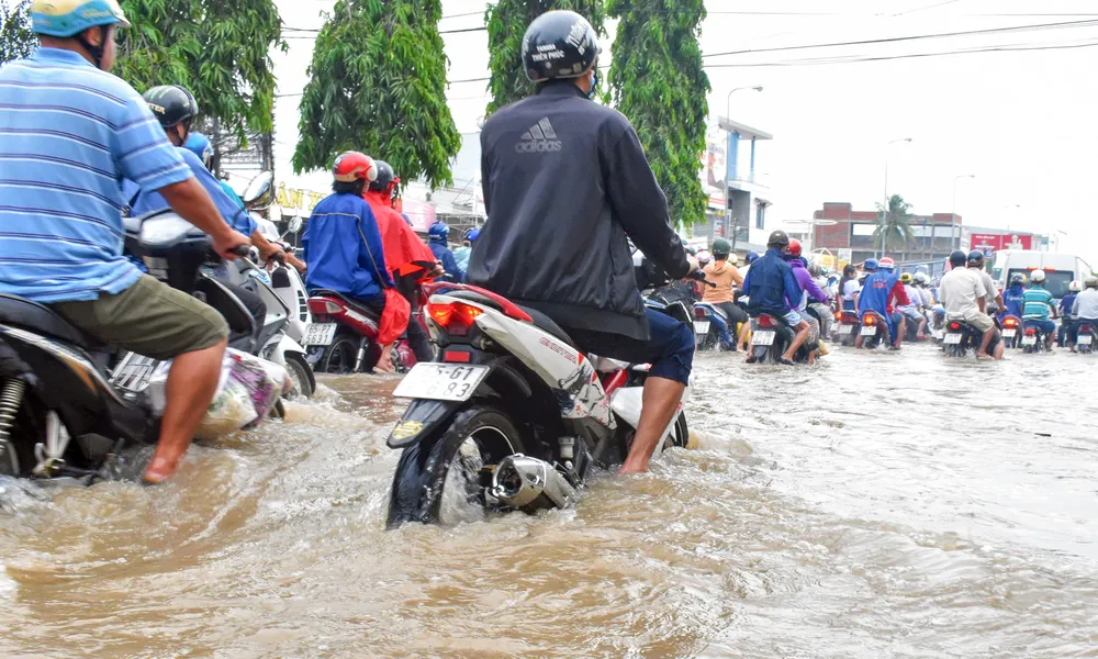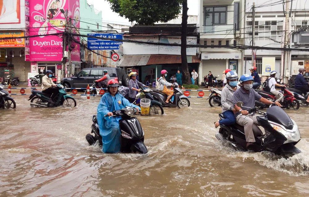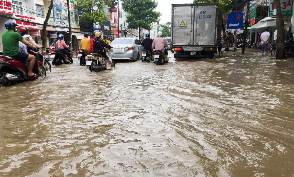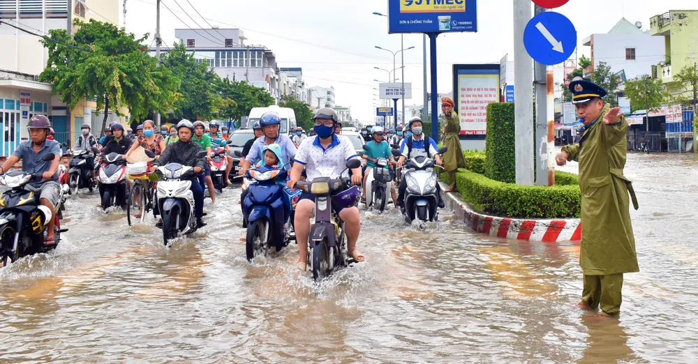 Triều cường lên cao làm ngập đường vào giờ đi làm, đi học khiến người dân hết sức vất vả.