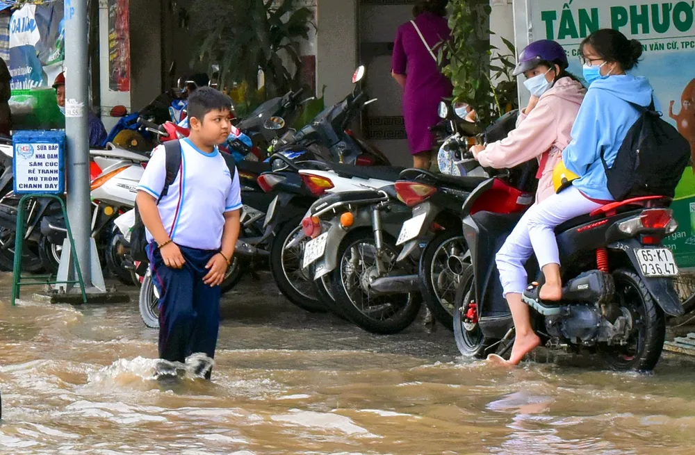 Nhiều tuyến đường nước ngập sâu, học sinh phải bì bõm lội nước đi học.