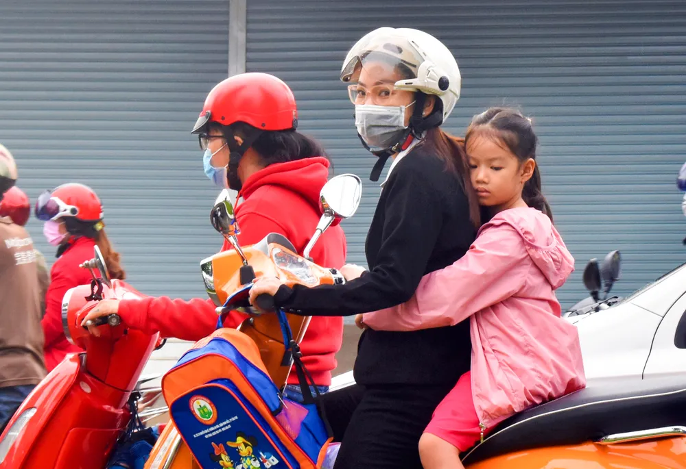 Gương mặt mỏi mệt của phụ huynh và học sinh khi vừa bị ùn tắc vừa ngán ngẫm khi nhìn thấy đoạn đường ngập nước.