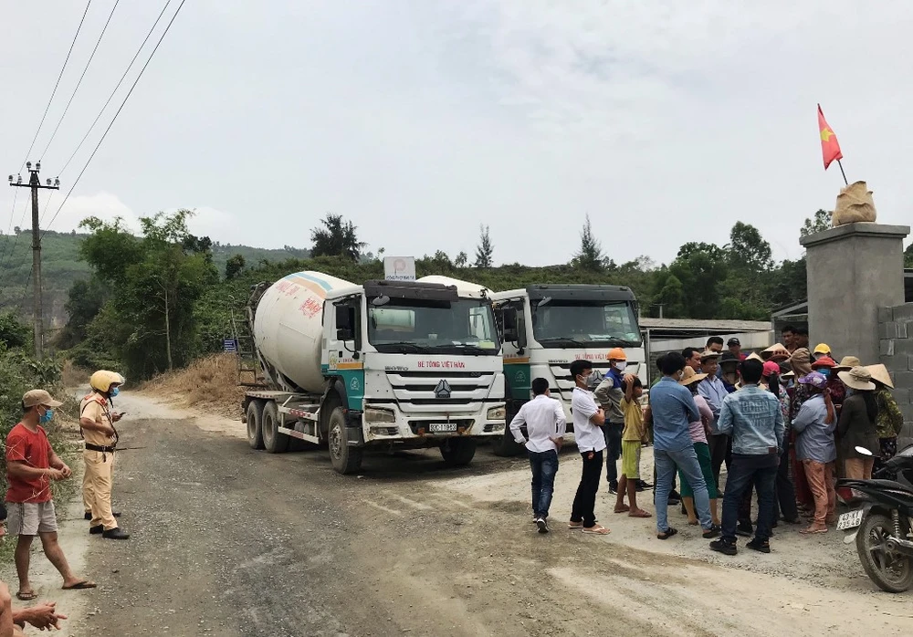 Xe bồn bê tông bị người dân chặn không cho vào công ty. Ảnh: HẢI HIẾU