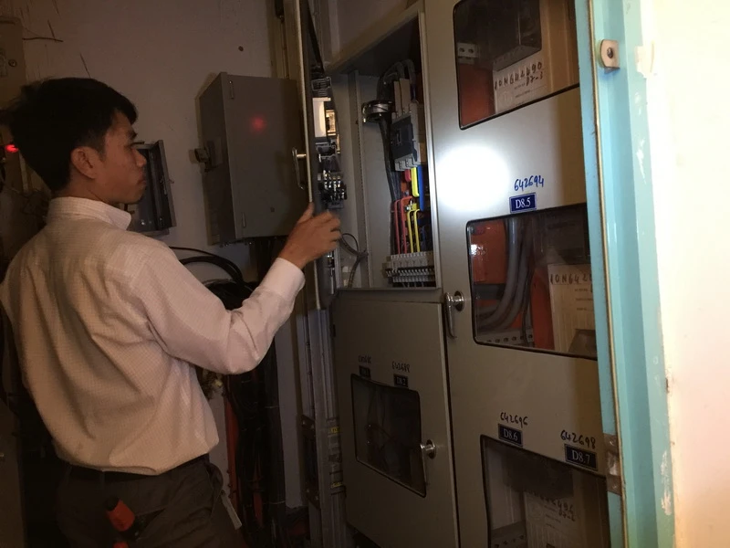 Nhân viên Ban Quản lý Chung cư 584 đang cắt điện các căn hộ nợ phí quản lý trên ba tháng. Ảnh: Quỳnh Như