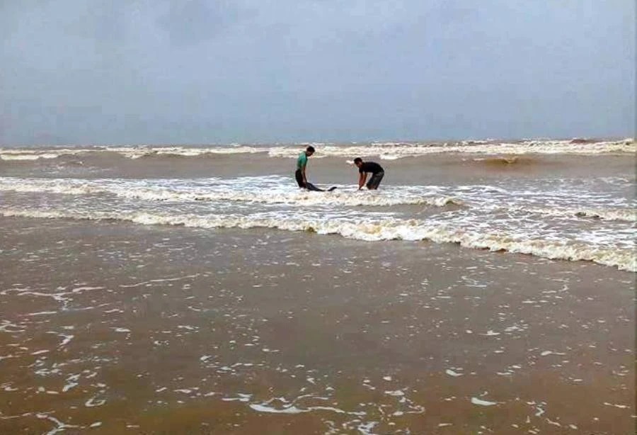 Người dân cho rằng cá heo vào bờ có thể là điềm báo bão lớn sắp vào đất liền.