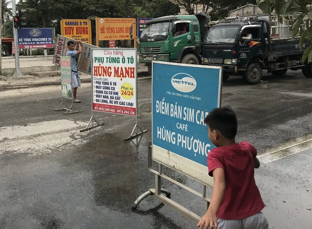 Người dân dùng các biển hiệu chặn xe để được tưới nước đường cho đỡ bụi. Ảnh: HẢI HIẾU